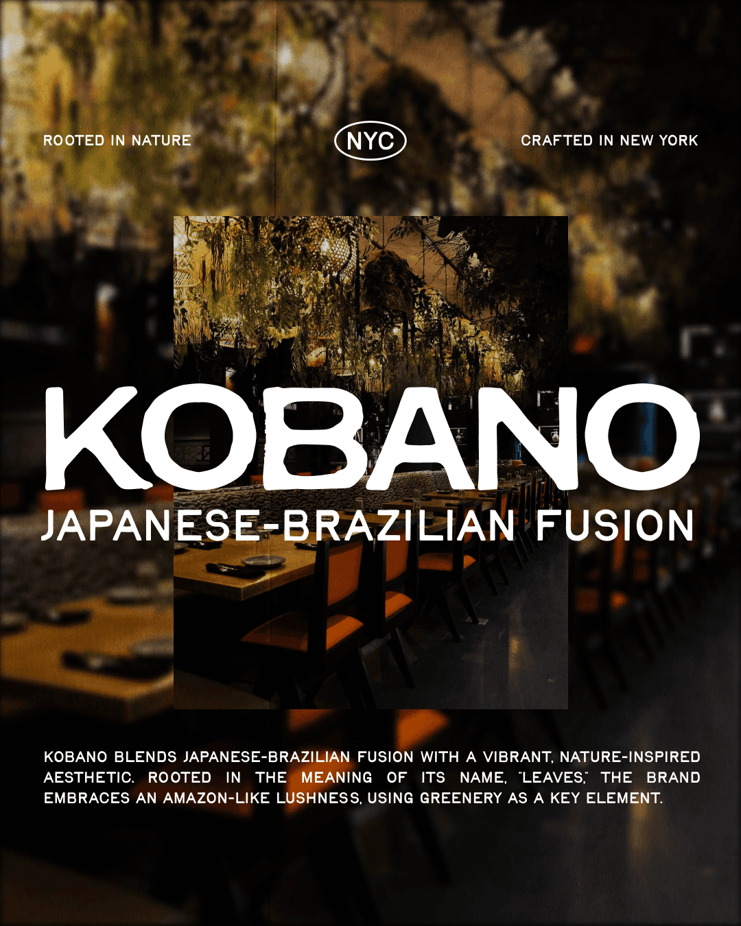 Kobano is a new Japanese-Brazilian fusion restaurant that came to us with a specific ask: create a brand identity that feels organic but elevated—something that pops while staying rooted in nature. By using a hand-drawn typeface, a deep, contrast-heavy orange, and macro nature imagery, we built a visual system that gave Kobano what they needed for an incredible launch and continued success in New York City.