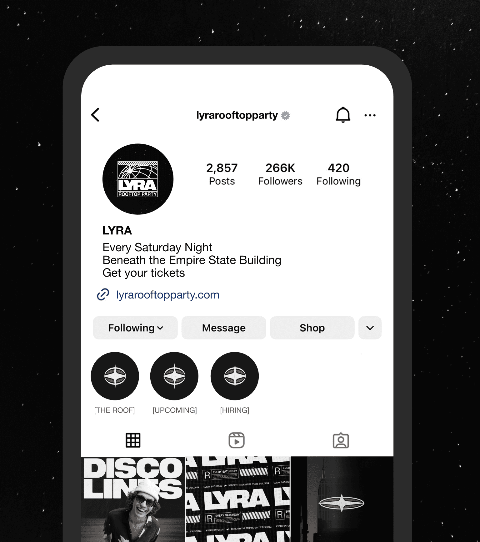 The Rose Gold team reached out with a blank slate and a big opportunity: take over a rooftop for the summer and turn it into something sick. No name. No brand. Just an idea. We created Lyra, inspired by the constellation known for music and storytelling. The brand leans into the fact that this rooftop series is at night - space, exploration, and a technical feel. From naming to visual identity, Lyra was built to evolve. We also designed the website and launch materials for social, giving the team everything they needed to hit the ground running.